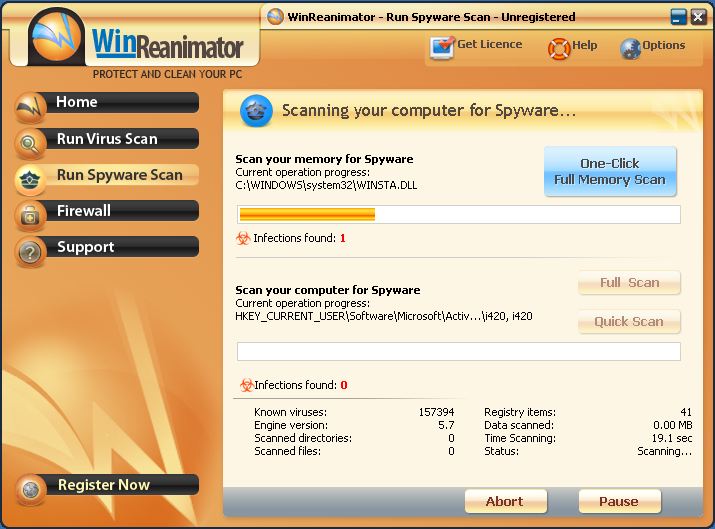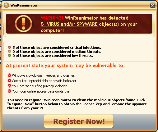 - По окончании сканирования пользователю выдаётся информация о том, что его компьютер инфицирован и для лечения компьютера необходимо зарегистрировать WinReanimator: