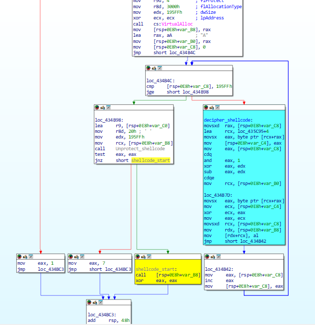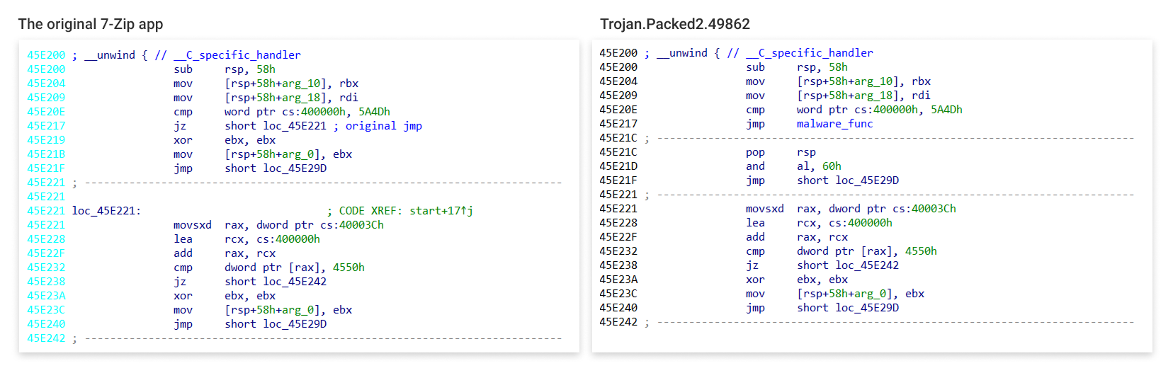 The original files of initially harmless programs are patched to run the implanted malicious payload. For this, a transfer command jmp is added to the start section of the apps. This transfer leads to a shellcode that decrypts the next malware stage.